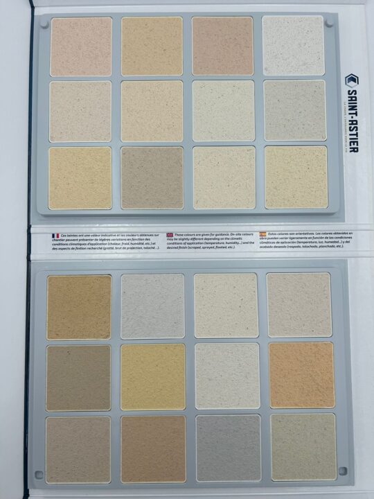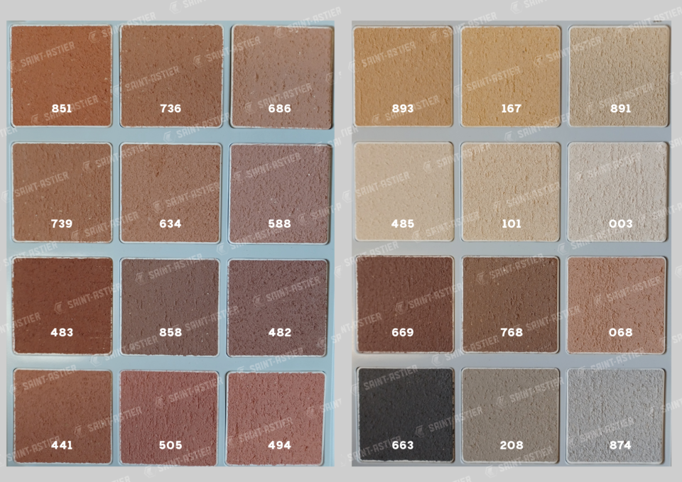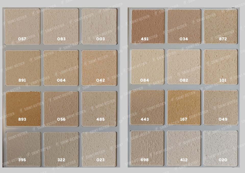 This illustrated range of colours is by no means exhaustive. For custom colours can be made, please contact your Saint-Astier® distributor. Visual appearance might vary with the granulometry of the mortar and the finish applied. The test panel will assure that the required final effect is achieved.